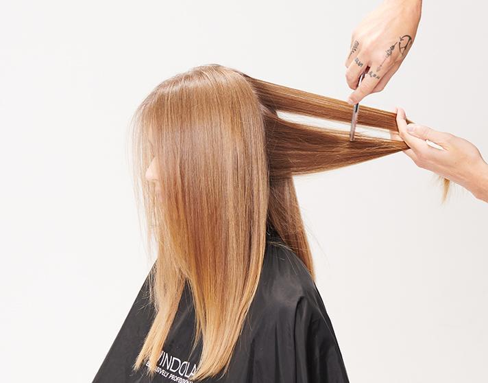 THE CUT & STYLING: A very long one length haircut with a bold between chin-to-shoulder length shorter one-side.